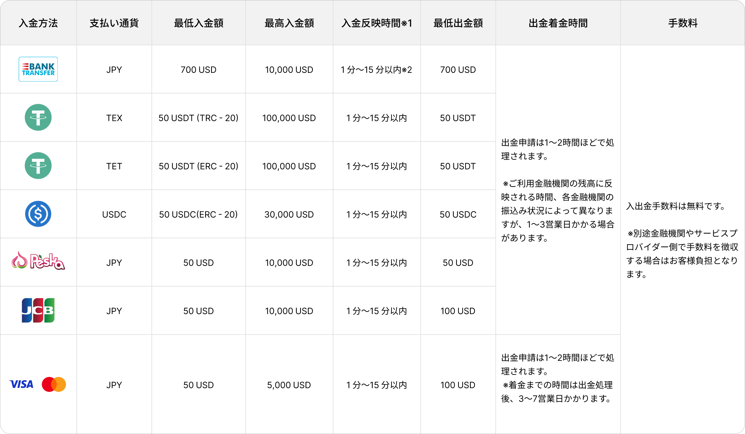 EBCでは入出金に一切手数料がかかりません。ただし、別途金融機関やサービスプロバイダー側で手数料を徴収する場合はお客様負担となります。
