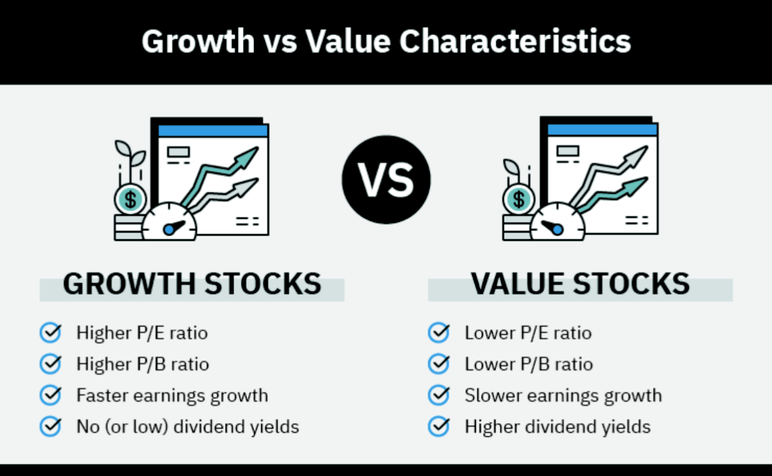 Ngược lại, cổ phiếu tăng trưởng đại diện cho các công ty được kỳ vọng sẽ tăng trưởng ở mức cao hơn mức trung bình so với thị trường. Các công ty này thường tái đầu tư lợi nhuận của mình vào doanh nghiệp thay vì trả cổ tức, với mục tiêu mở rộng nhanh chóng. Cổ phiếu tăng trưởng có thể thú vị nhưng thường đi kèm với rủi ro cao hơn vì hiệu suất trong tương lai của chúng dựa trên kỳ vọng tăng trưởng nhanh, có thể thành hiện thực hoặc không.