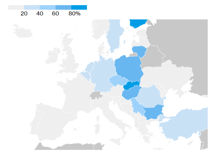 剩下包括通过德鲁日巴管道为德国东部一家重要的炼油厂施韦特提供足够的替代石油,该炼油厂严重依赖俄罗斯原油,由克里姆林宫支持的生产商—俄罗斯石油公司Rosneft PJSC提供。从图中可以看出,大多数欧洲东部国家仍然依赖俄罗斯,原油进口量达到总量的一半以上。