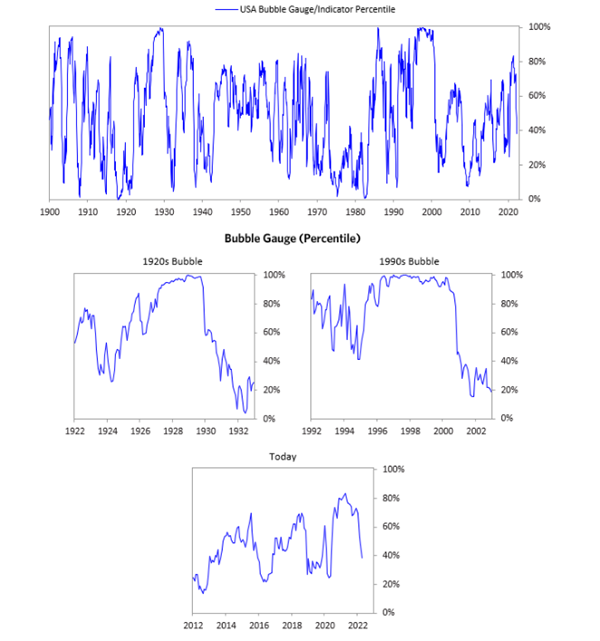 下面的图表展示了这一情况。第一张图显示了美国股票市场整体的泡沫指数/指标,可以追溯到1900年(当时是大约40个百分点)。图表还放大了过去几年的指标,以及20世纪20年代末的泡沫和90年代末的泡沫(在这两种情况下,指标都达到了100%)。