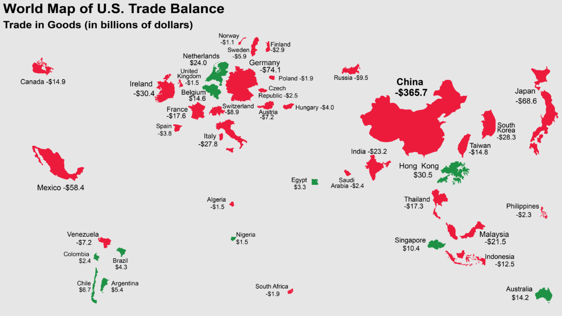 美国在贸易上的逆差在全球范围内都存在,如上图中所示,红色表示跟美国在贸易上有逆差的国家,绿色的则表示跟美国贸易有顺差的国家。从中可以看出,美国对中国贸易的逆差最大,而对香港的贸易顺差最大。