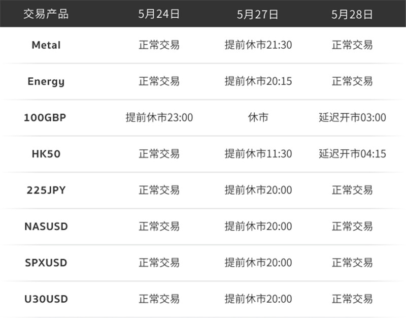 2024 年 05 月 27 日是即将到来的阵亡将士纪念日&春季银行假日,我们在此温馨地提示您,EBC 部分产品的交易时间将于此期间进行调整,可能会出现点差扩大、流动性减少的情况。