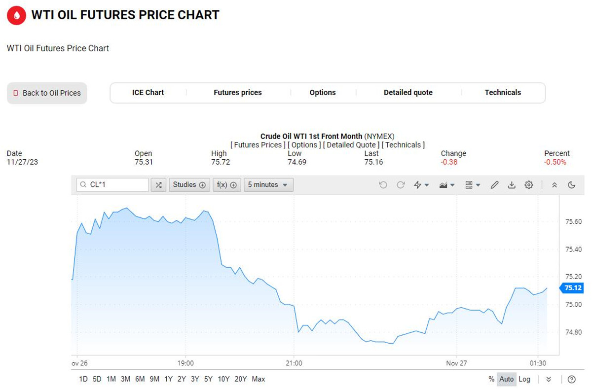 今天週一(2023年11月27日)美國原油基準西德州中質原油(WTI)在約75.00美元附近進行交易。由於石油交易商正在等待石油輸出國組織及其盟國(OPEC+)週四會議的結果,WTI市場動力出現下滑。這項等待導致了市場交投的相對冷淡,投資者謹慎觀望,預計在OPEC+會議結果公佈之前,市場表現較為保守。因此,目前WTI價格受到了一定程度的限制,而市場趨勢也表現出一定的不確定性。