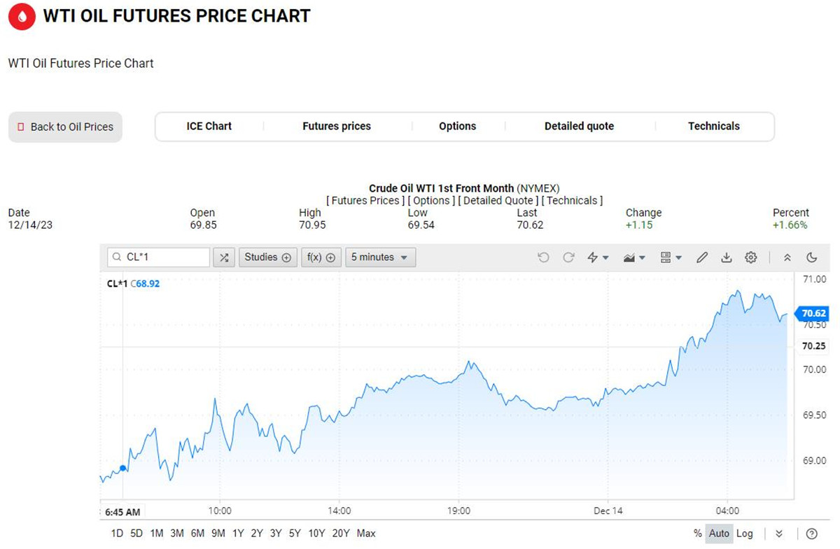 今天週四(2023年12月14日)的亞洲市場,WTI原油價格似乎延續了連續第二日的上漲勢頭,上升至70.00美元附近。截至12月8日當週,美國能源資訊署公佈的原油庫存數據和聯準會將利率維持在5.5%的決定均符合市場預期,促使原油價格出現了上升。